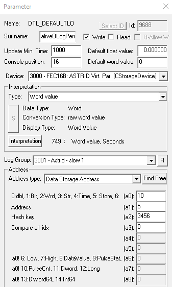 aliveOLogPeriod: A storage device pulse count word (a0:10). When DataLogger is logging to the original database a value between 300 and 310 is written to this parameter every second to signal that the data logging is active. When the data logging is stopped, the value is set to zero.