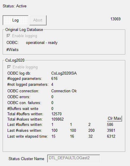 To avoid two instances of the DataLogger is running and making duplicated loggings in the log databases, a ‘Status Cluster Name’ can be specified. The status cluster is a ConSys parameter cluster that must have the following parameters: