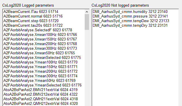 The two lists ‘CsLog2020 Logged parameters’ and ‘CsLog2020 Not logged parameters’ lists the parameters being logged/not logged. The first number after the parameter name in the lists is the log group id. The second number is the parameter id.