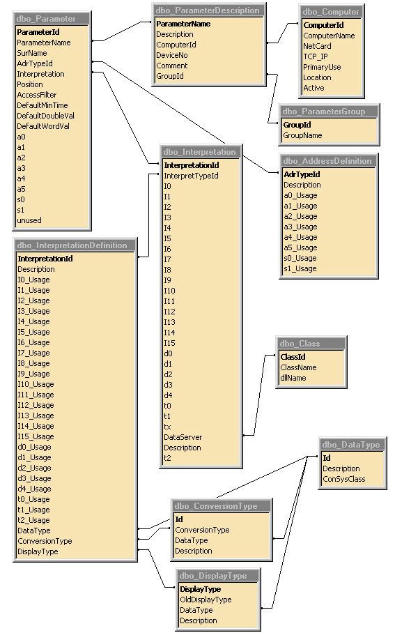 The ConSys system database is based on an ODBC connection to a relational database. The Microsoft SQL server is used as system database. The database tables are edited directly with Access and by the Database Editor - a special tool developed for maintenance of the database tables. This document describes the central tables for the system. These tables define the ConSys parameters, addressing, conversion and display formats etc. Additional tables for other purposes are like the console tables and message log tables are described elsewhere.